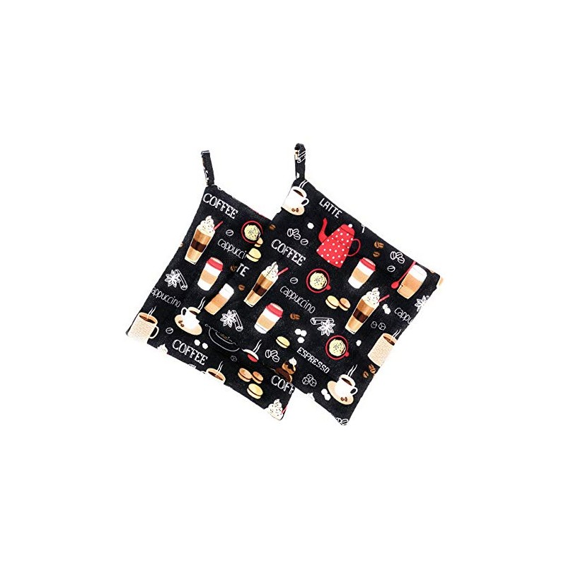 Set of 2 - Espresso Cappuccino Latte Coffee on Black Reversible Square Hot Pot Pan Plate Holders Hot Pads Trivets