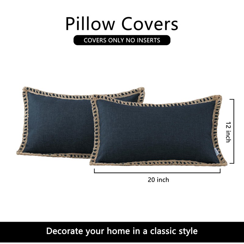 Set of 2 Farmhouse Throw Pillow Covers - Burlap Linen Trimmed Tailored Edges Decorative Cushion Covers for Bed Home Outdoor Decoration (2 Pieces, 26" x26", Dark Blue 3/ Linen Band)