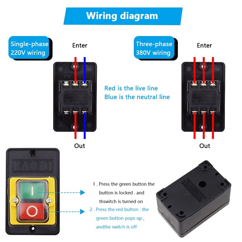- Easy to use: direct switch does not become a contactor. The ON button (green) is self-locking and the OFF button (red) is automatically reset.