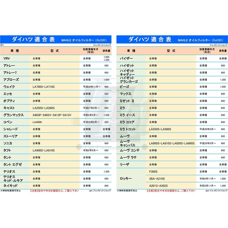 - Set Contents: 2 oil filters "Model Number OJ101" for Suzuki, Subaru, Daihatsu, Toyota, Nissan, Mitsubishi, Mazda. Note: Please check the model and the following conditions in the image compatibility chart and the first registration date (mentioned on the car verification) before purchasing