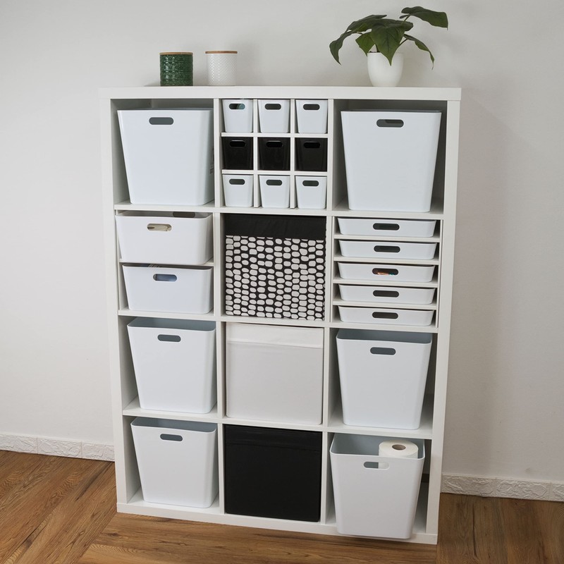 The boxes are ideal for cube shelves such as Ikea etc. But also on other shelves they look elegant and provide order. - Material: