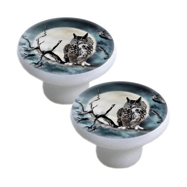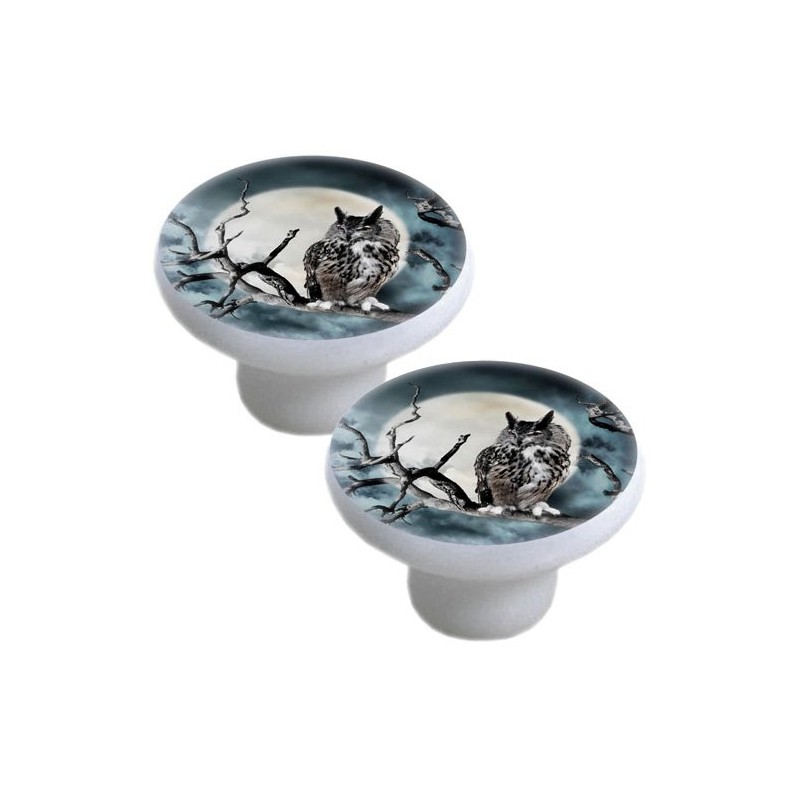 Set of 2 Perched Owl with Moon Ceramic Cabinet Drawer Knobs
