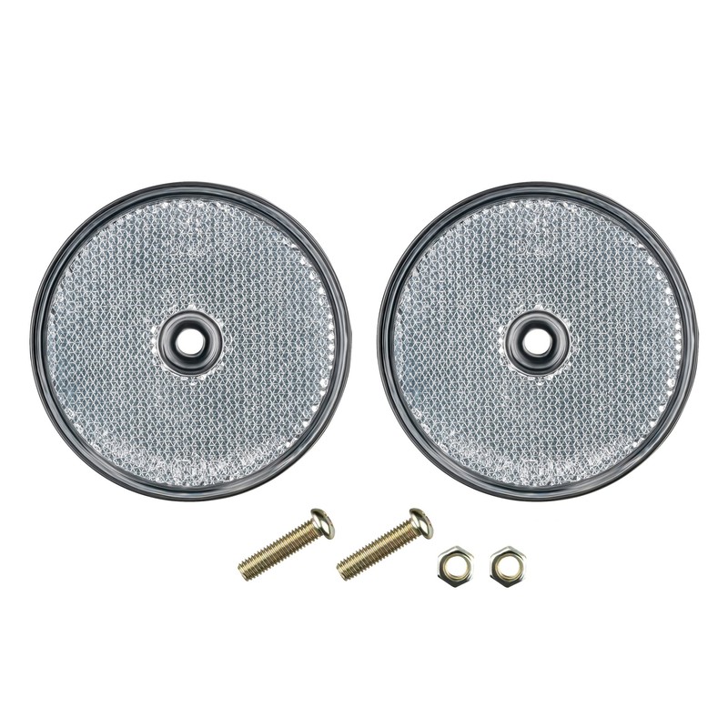 2 x round white reflector made of plastic with E-mark, approved for road traffic. Dimensions: 70 x 70 x 9 mm. Suitable for car trailers, caravans, trucks, etc. Box contents: 2 x round white reflector including mounting material