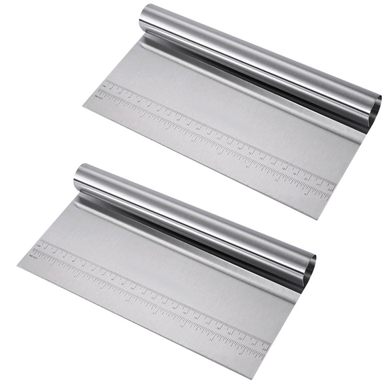 - AFFORDABLE TWO PACK COMBINATION We provide you with a two-pack stainless steel dough cutter to meet your different usage scenarios and needs. Stainless steel dough scraper with handle. You can process several ingredients at the same time or you can have a replacement at any time to use it.