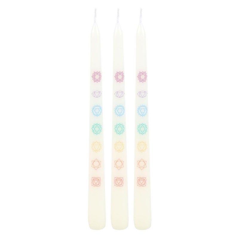 - Illuminate your living space with this pack of 3 white taper candles, adorned with the vibrant colors of the seven chakras for a touch of spiritual elegance.