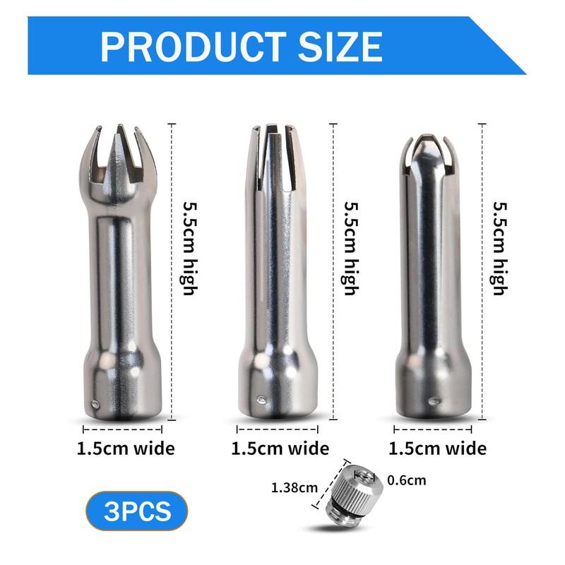 - 3-piece cream dispenser set comes with base: includes 1 tulip nozzle, 1 star nozzle, 1 cross nozzle and adapter with internal thread. You can choose from three different styles to create different buttercream shapes.