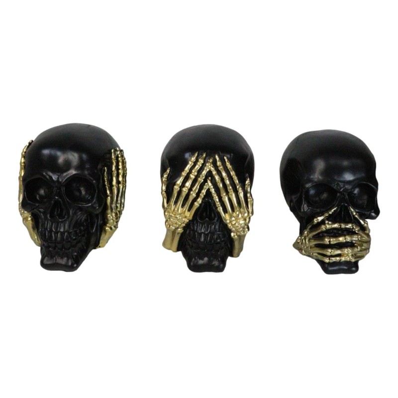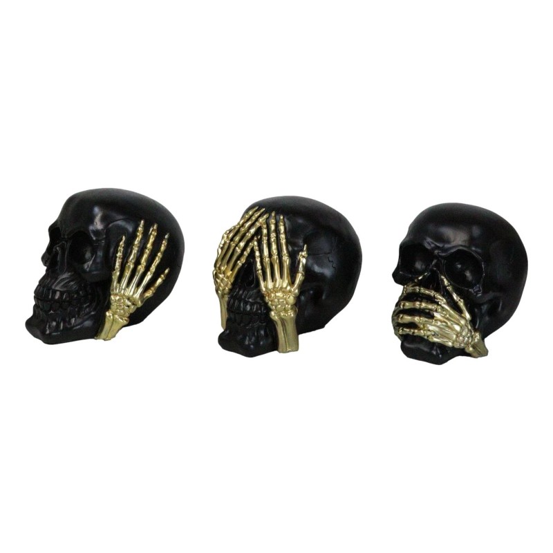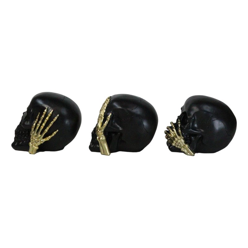 • These skulls trio embody the classic "See no evil, hear no evil, speak no evil" proverb. Hand painted for a gothic black finish, their hands are finished in gold for a stark contrasting effect.