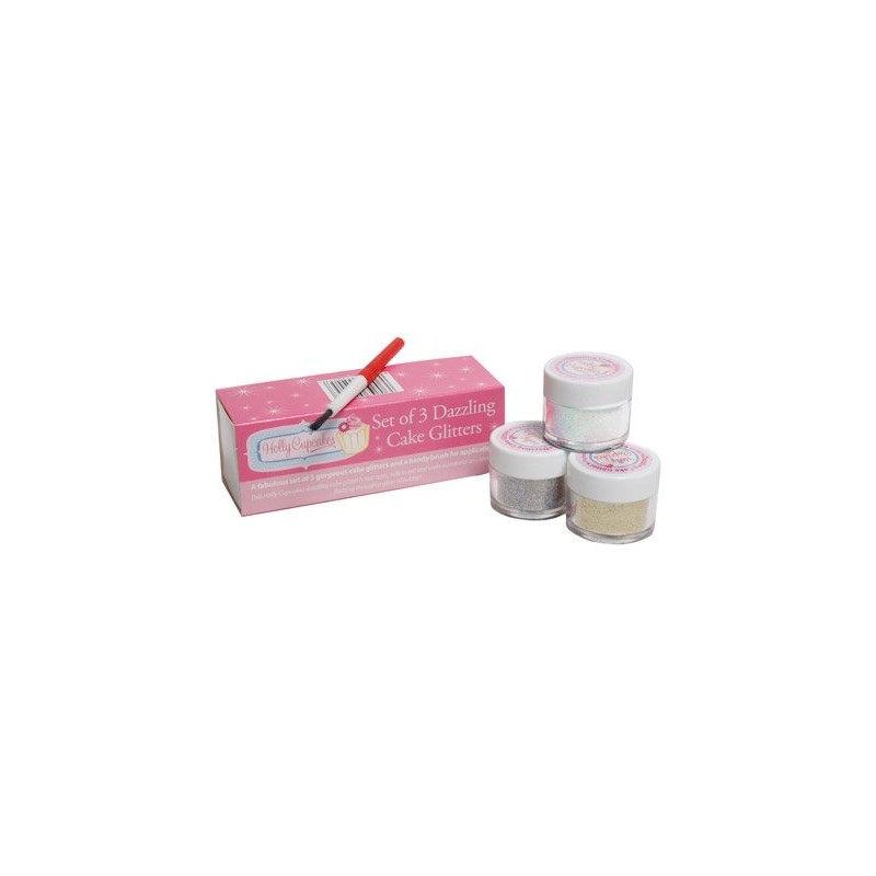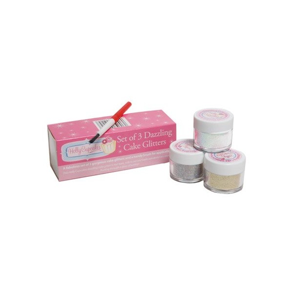 Set of 3 Holly Cupcakes Stunning Sparkly Decorating Glitters with Application Brush: Silver, Gold and Iridescent White