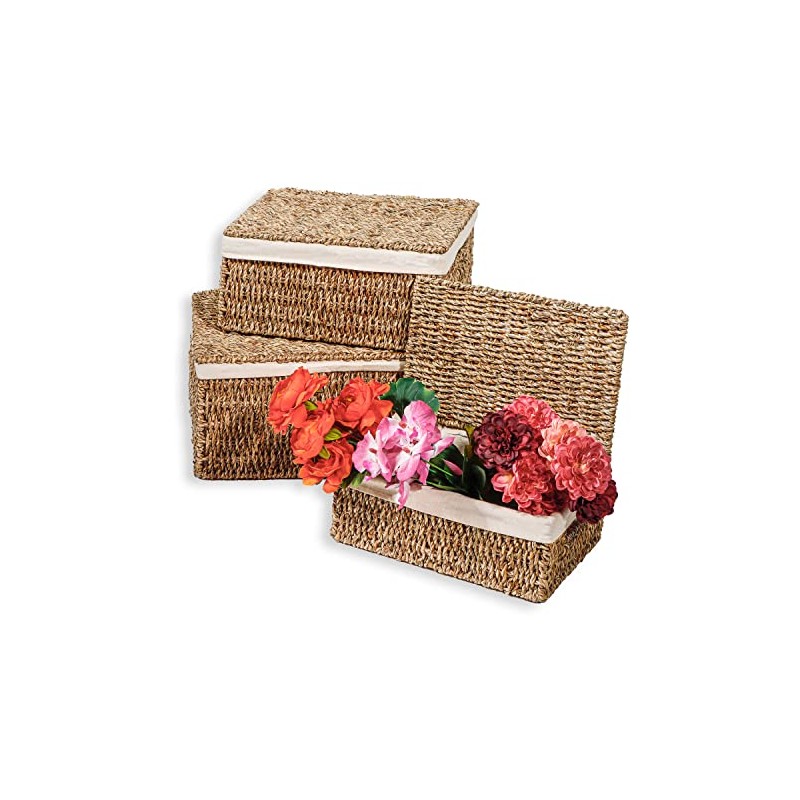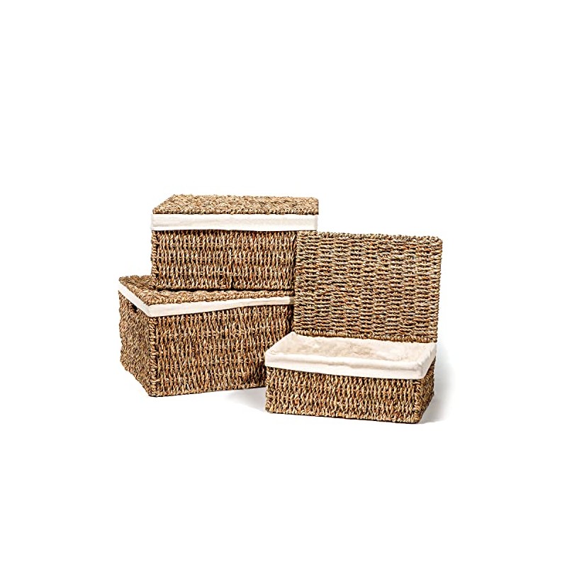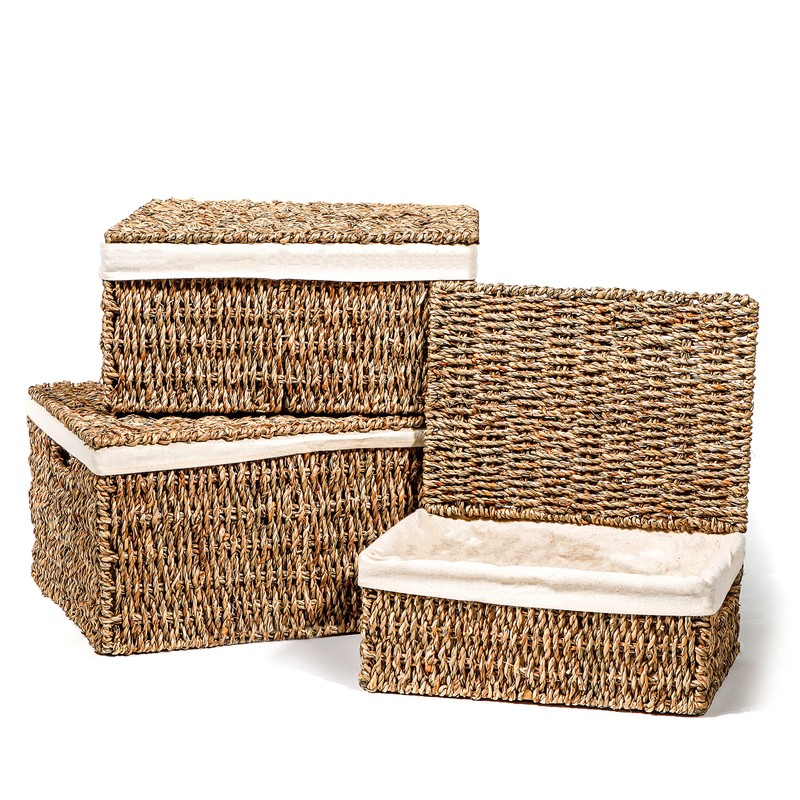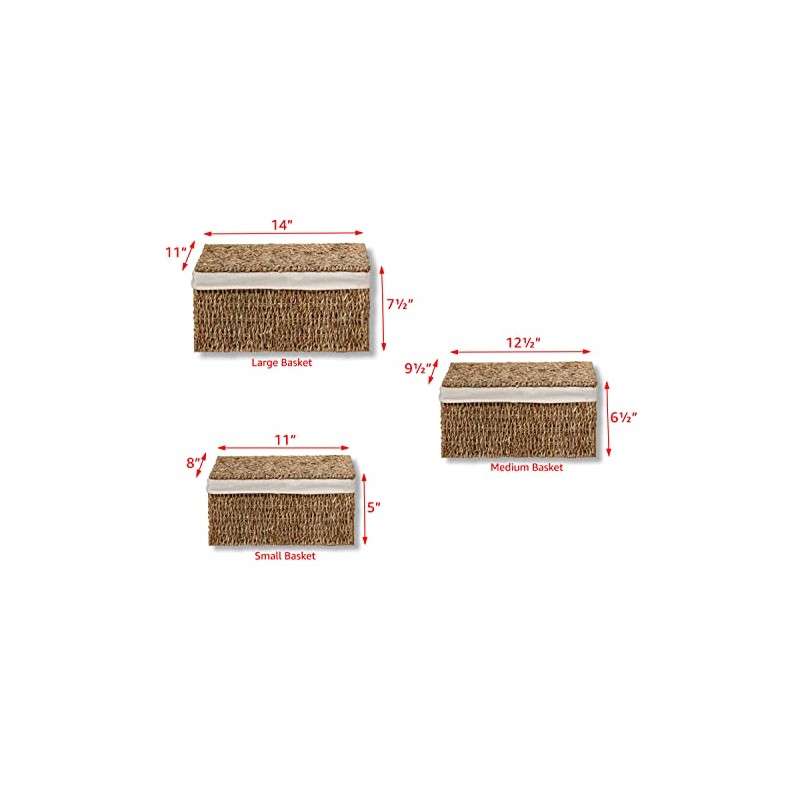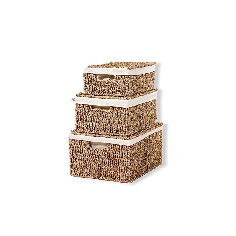 Set of 3 Rectangular Seagrass Baskets with Lids and Removable Fabric Liners by Trademark Innovations (Small)