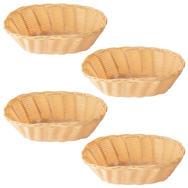 Set of four light brown colour poly-rattan storage baskets with small oval shape and size. The poly-rattan material is a synthetic alternative to traditional rattan that looks the same and feels similar but is more resistant to wear and tear. The baskets are ideal for food presentation and can be used for a variety of different purposes. For best care please hand wash only (not dishwasher safe).
