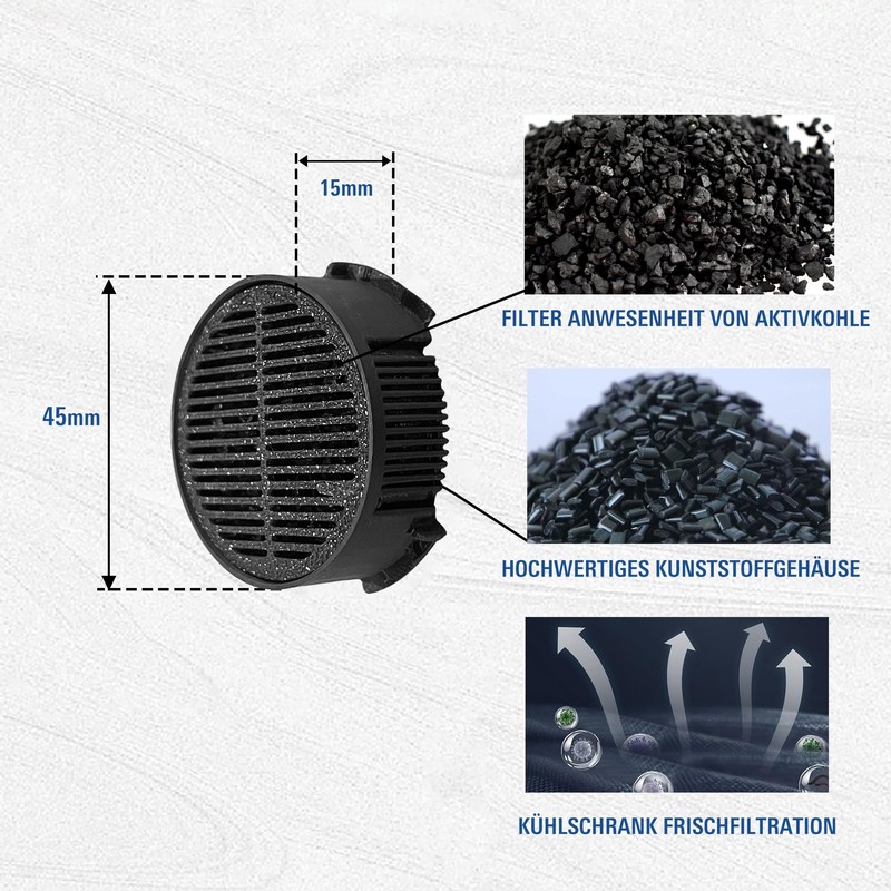 - Product details: dimensions: diameter 4.5 cm, height: 1.5 cm, colour: black, shape: round, material: plastic, principle: activated carbon adsorbs odours and purifies the air in the refrigerator.