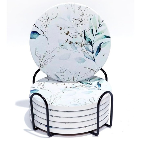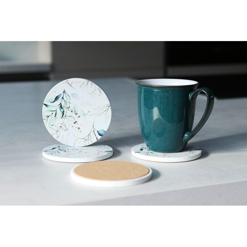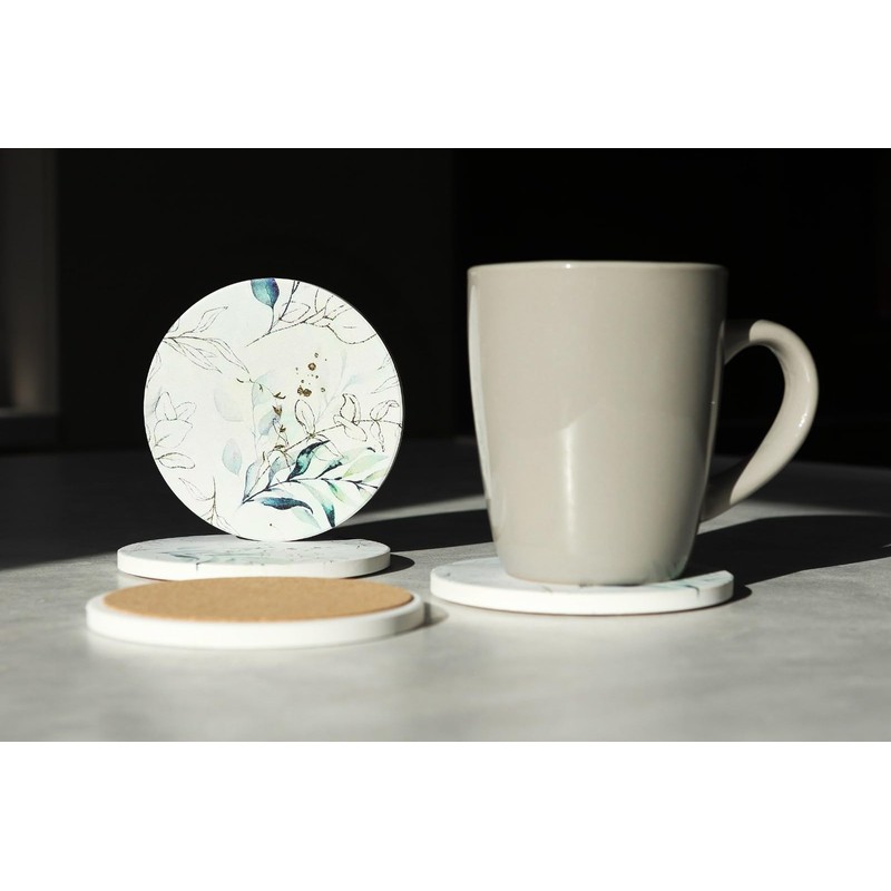 Set of 4 Ceramic Drink Coasters Stunning Minimalistic Flower - Absorbent Cork Base - Heat Resistant - Non-Slip Grip Base - Housewarming Gift (Set of 6 with Holder)