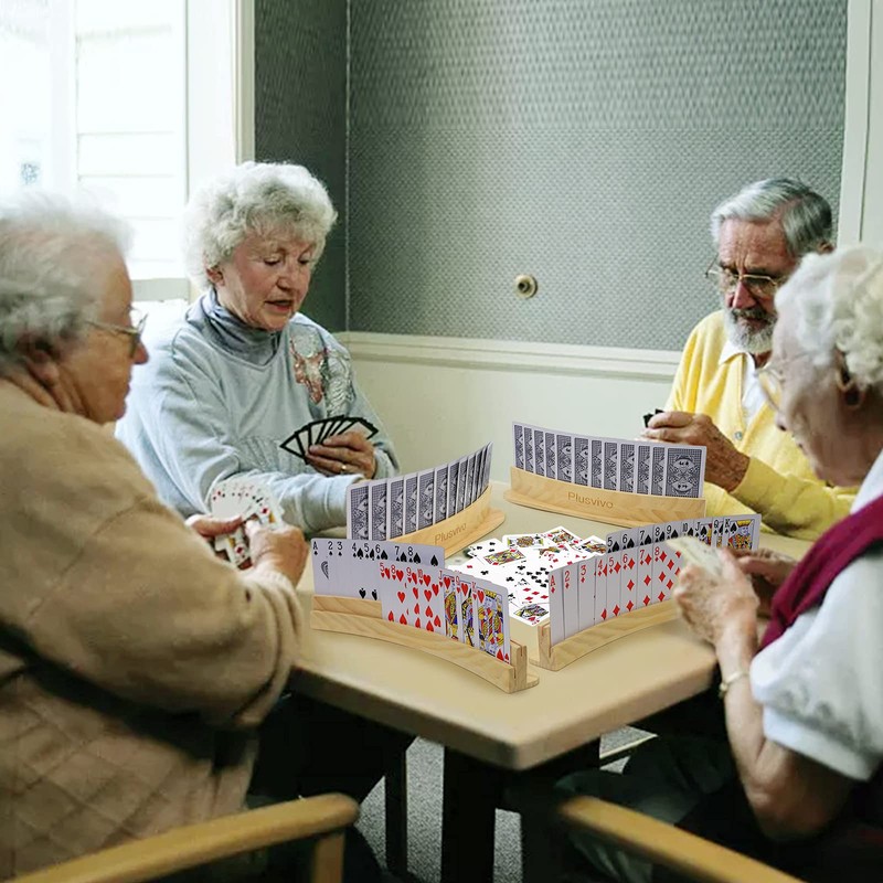 - [Plusvivo Set of 4 Premium Playing Card Holders] Plusvivo Soild Wood Curved Playing Cards Holders Set of 4 free you hands when you playing cards games, perfect for children or adults with arthritis to play Bridge Canasta Go Fish Hand and Foot etc. These playing cards racks each measuring 13 x 1.78 x 1.8 inches.