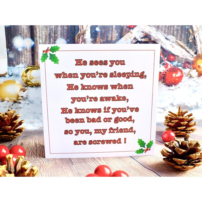- * Pack of 4 Funny Christmas Cards * In four totally unique funny verses which I'm afraid are entirely drink or poor behaviour related, but then what’s Christmas without a tipple or two! Perfect for those family and friends that might have only just scraped through onto Santa’s Nice List!