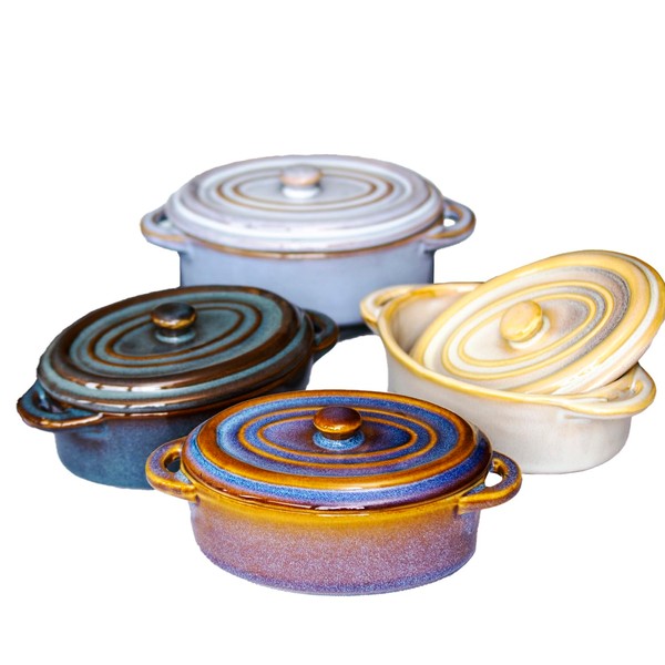 Set Of 4 Oval Reactive Glaze Mini Casserole Dishes 230ml Stoneware Oven Pots With Lids