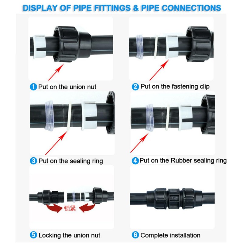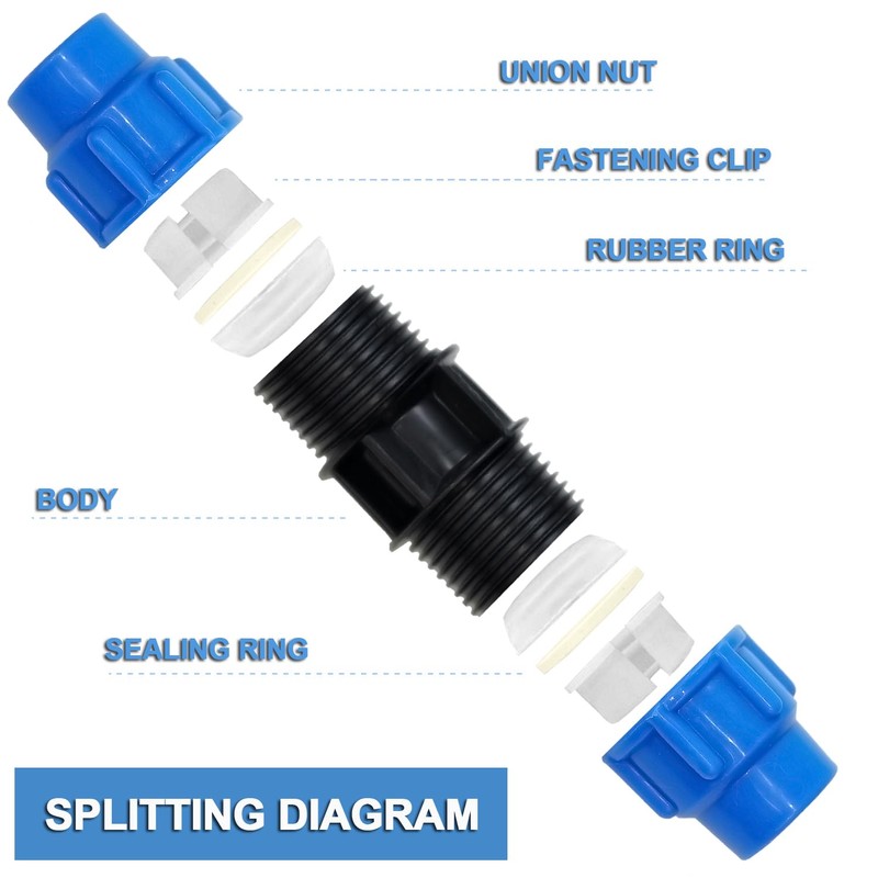- Material: nut (PP), clamping rings (POM), O-ring (PP), PE pipe screw connection (PVC), rubber ring (rubber). Stable and not easily deformable.