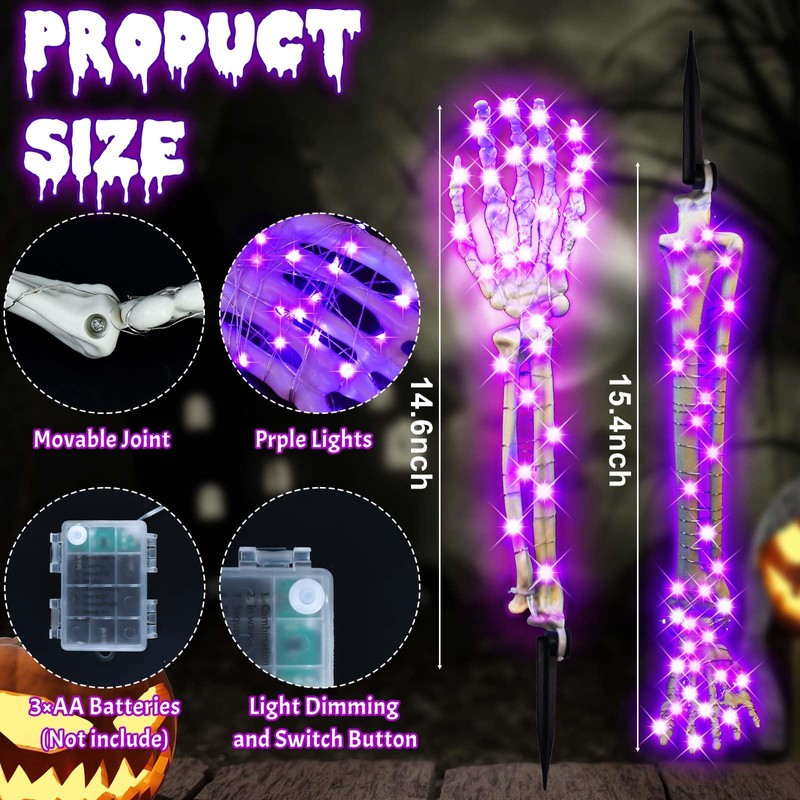 - 8 Purple Lighting Modes for Pumpkin Arms Legs: Our unique halloween decoration skeleton arms and legs, adorned with purple LED string lights, is perfect for indoor and outdoor pumpkin decorations. Powered by 3 AA batteries (not included), the string lights can offering 8 modes: Combination, In wave, Sequential, Slo Glo, Chasing/Flash, Slow Fade, Twinkle/Flash, and Steady On