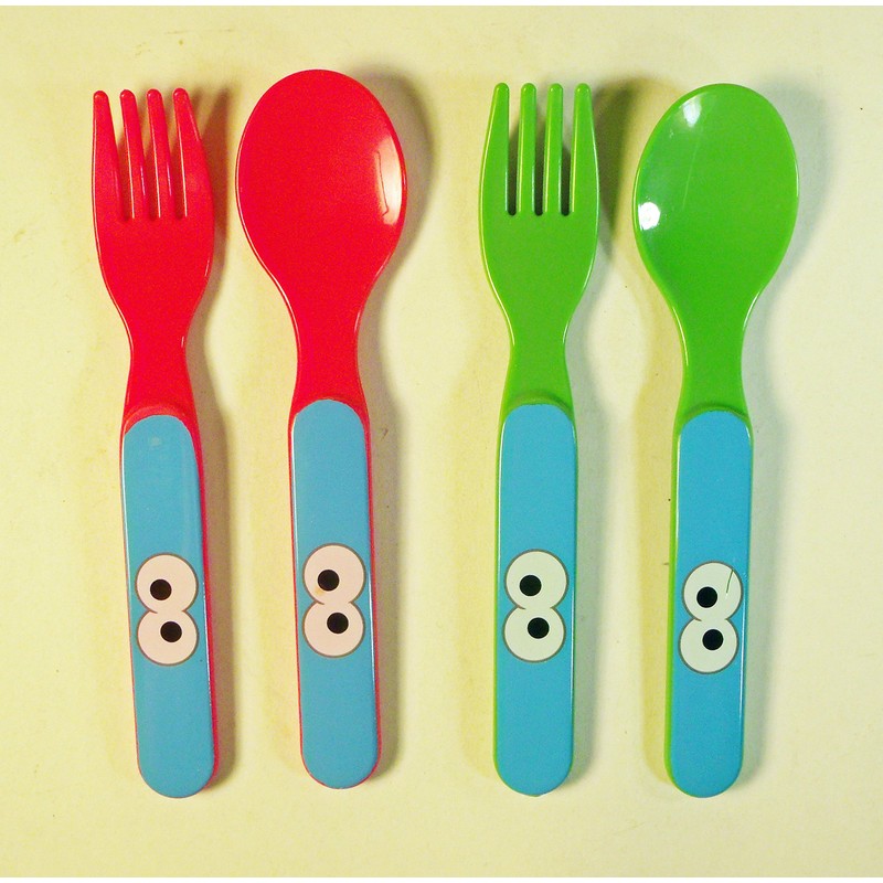 - Forks and spoons come in green and red and measure 5-1/2 inches long.