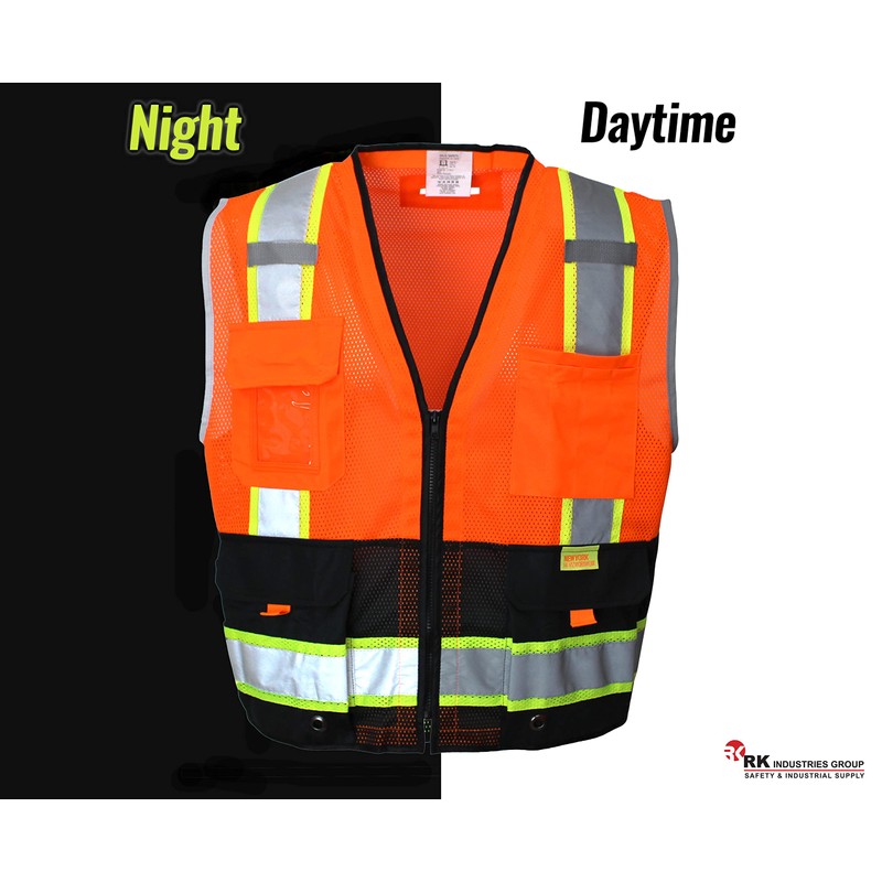 SET OF 5 P5511 Class 2 High viz Two Tone Reflective Strips Breathable Mesh Vest, Pockets Harness D-Ring Pass Thru, ANSI/ISEA, Construction Traffic Emergency (Large, Neon Orange)