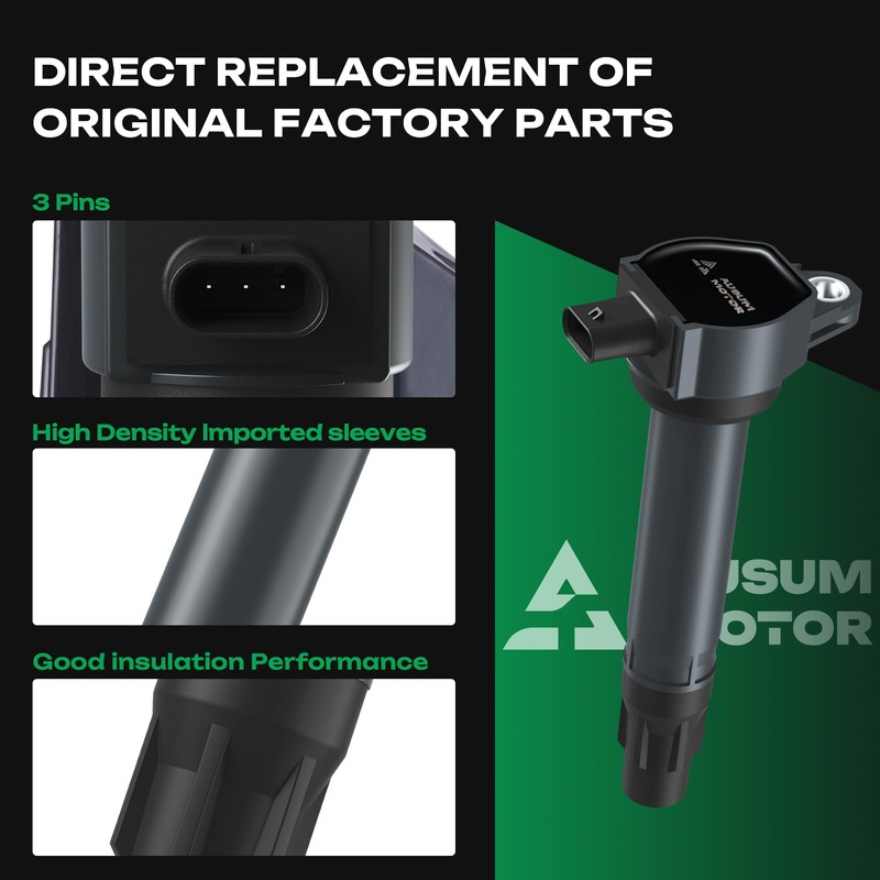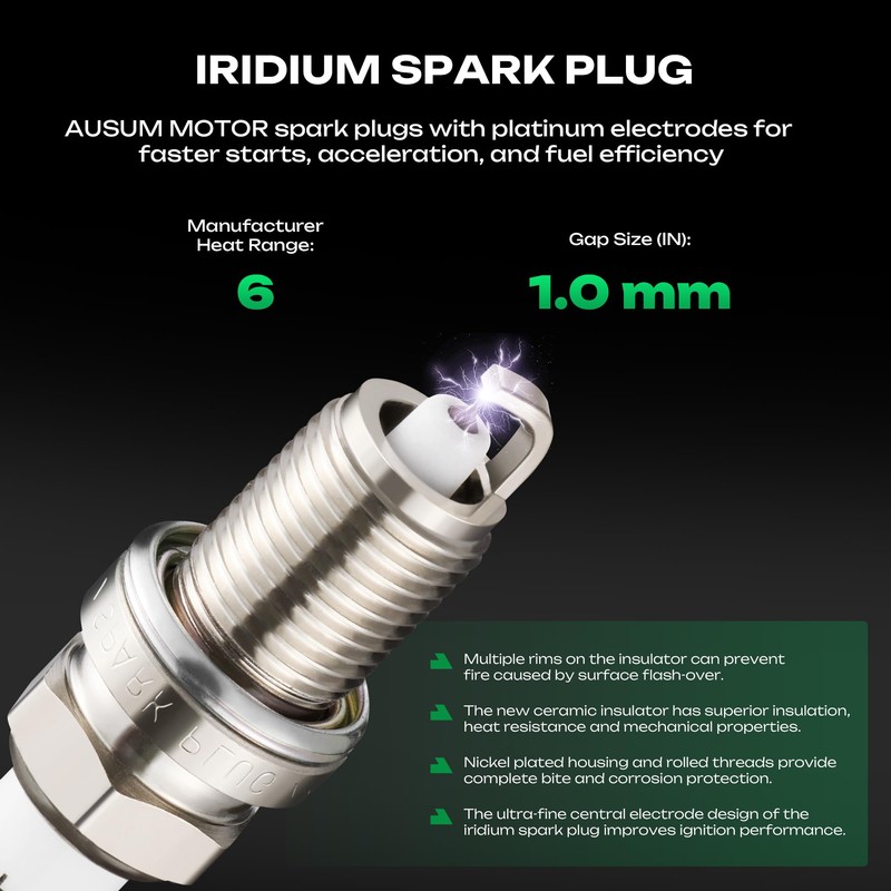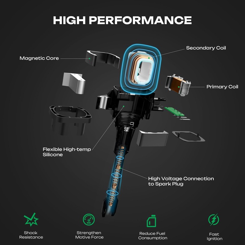 - High-Performance Spark Plug Coil Pack – Engineered with iridium Spark Plugs for 100,000+ mile durability and stable ignition. Ignition Coil Set features stainless-steel springs and heat-resistant connectors to prevent radio interference and fractures, ensuring smooth starts and fuel efficiency