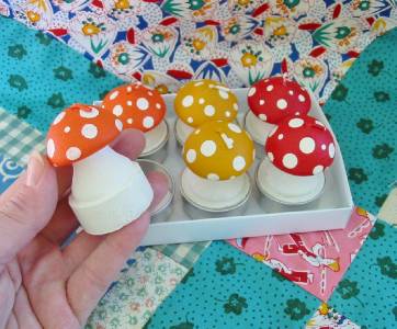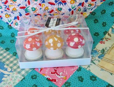 These would be a cute gift when you want to give someone something nice but don't know them well. Who doesn't like cute mushrooms and who doesn't like candles? Or they're a great gift to yourself. You get the set of 6 in a box. There are red, sunflower and orange candles. They are about 2 1/4 inches tall and 1 1/2 inches across. They're each in a metal holder. Almost too cute to burn but not so expensive that you can't.