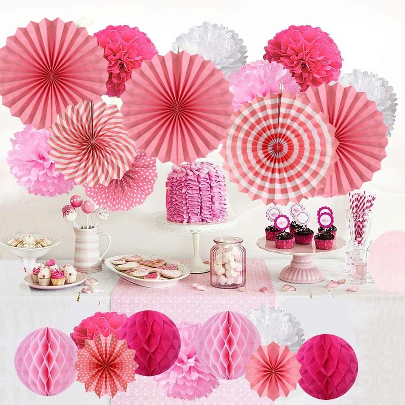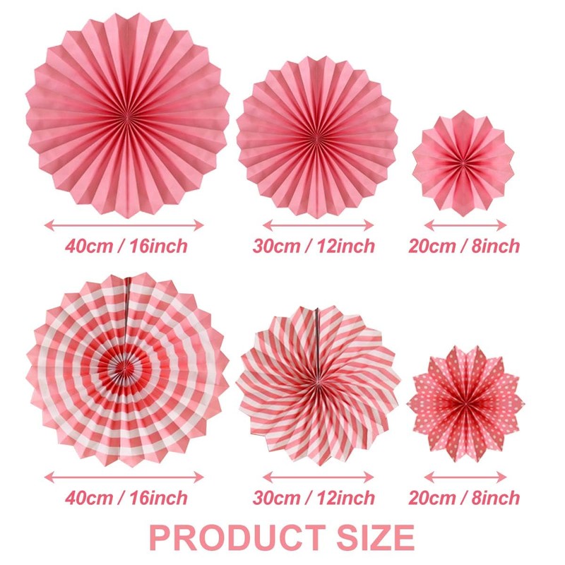 - DECORATIVE PAPER SET: pink hanging paper fans with 6 pieces of different sizes and different patterns, 40cm x 2/30cm x 2/20cm x 2, great decorative accents at parties and celebrations.