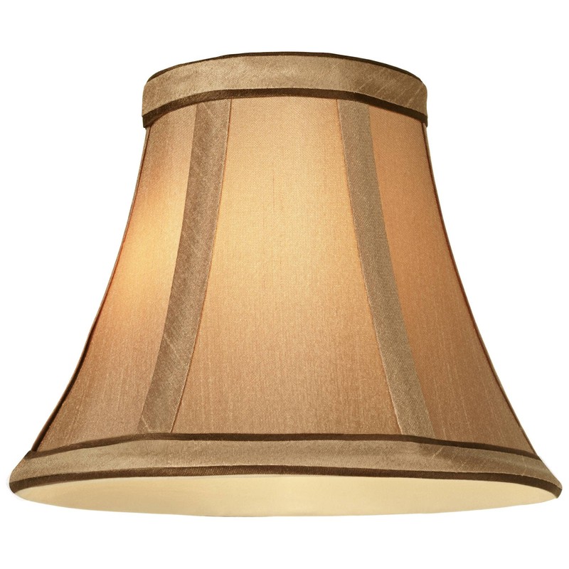 Brown trim highlights the warm, elegant tan fabric of this set of six modern bell fabric lamp shades from Springcrest. Each features a graceful curve with a polished brass finish clip-on fitter for easy installation on any fixture. These shades are designed for use with candelabra bulbs.