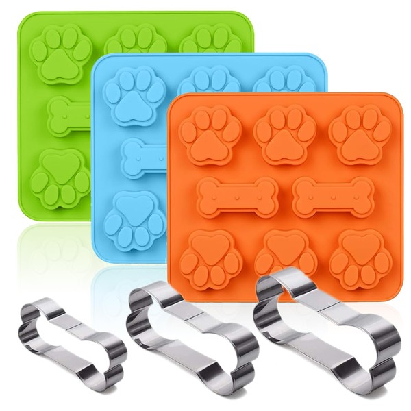 Set of 6,SAGOOITS 3 Packs Silicone Molds Puppy Dog Paw & Bone Shaped 2 in 1 and Stainless Steel Cookie Cutter,for Homemade Treats Cat Animal Ice Candy Chocolate Baking Mold(Blue&Green&Orange)