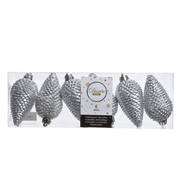 Set of 6 Shatterproof PINE CONE Christmas Tree Bauble Decoration - 8cm (SILVER)