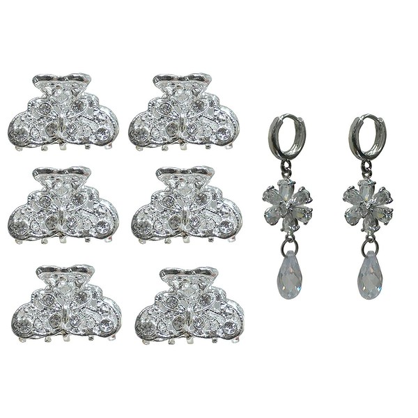 Set of 7 Bridal Package 6 Silvery White Mini Hair Claws Plus 1 Pair of TearDrop Dangle Earrings 6-1-F750tearDrop