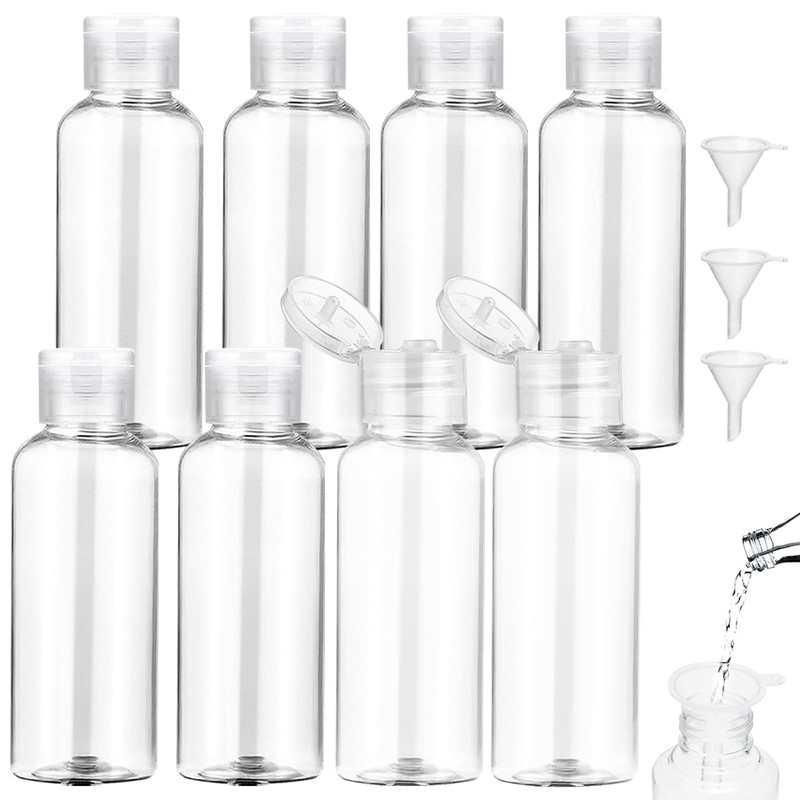 Set of 8 Travel Bottles for Filling, Travel Bottles Set, 100 ml Transparent Liquid Bottles for Filling with 3 Small Funnels, for Shampoo, Shower Gel, Lotion, Cosmetics