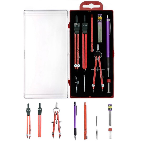 - Professional 9-piece compass set: you will receive 2 compasses (1 small and 1 large), extension bar x 1, adapter x 1, pencil lead x 1, pencil sharpener x 1, ruler x 1 and shatter-proof plastic box x 1. Mathematics geometry sets are very suitable for use in schools, woodwork, workshops or at home.