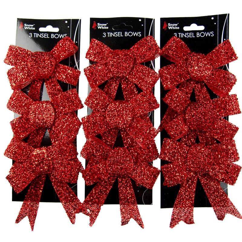 Set Of 9 Glitter RED Bow Christmas Tree Baubles Decorations