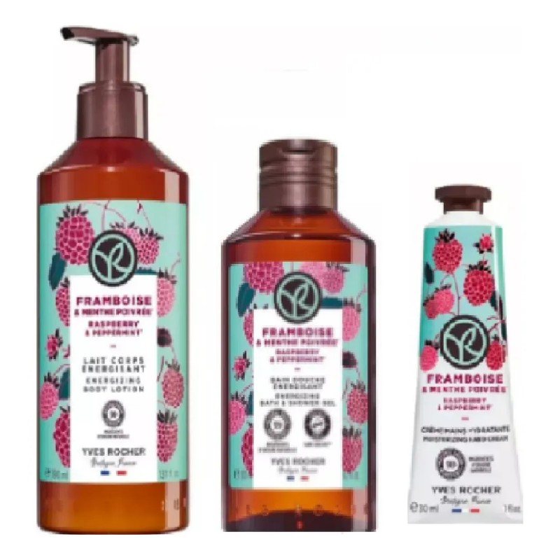 Descubre el Set Yves Rocher Frambuesa, un kit de 3 productos corporales con fragancia de frambuesa y hierbabuena.