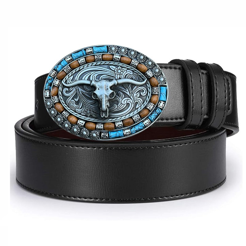 Seternaly Bull Skull Belt Buckle Horse Hat Native American Belt Buckle Turquoise Wooden Beads Decorated Belt Buckles for Men Women, Native-003, 3.94*2.91 in