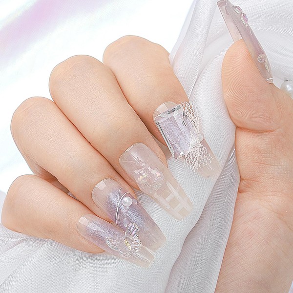 - 【Exquisite Design】Long trapezoid nude false nails, lace and large rhinestones and large pearls, understated but luxurious, purple sequins with white checkered pattern, printed butterflies and 3D laser butterfly, overall fashion and luxury. Great not only for parties, but also for matrics and other important occasions. Handmade false nails are cost-effective and look natural like your fingernails. Even beginners can easily master them. You can create the same nail art at home without having to go out