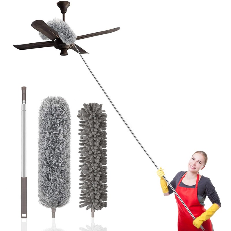 - BENDABLE MICROFIBER DUSTER - Includes stainless steel extension pole*1, microfiber duster head*1, chenille duster head*1. Bendable duster head can quickly capture and absorb fine dust and hair on the ceiling fan.