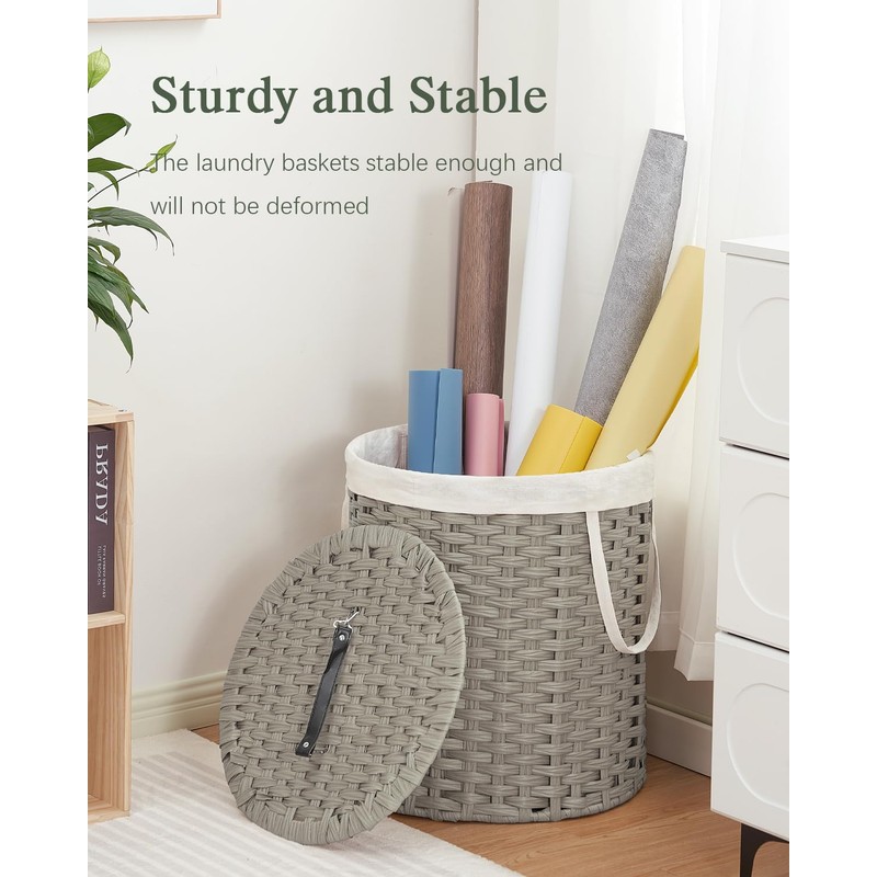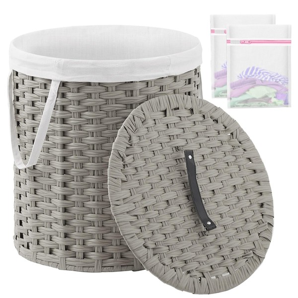SETVSON Laundry Hamper with Lid Wicker Laundry Hamper Round 26.5 Gal (100 L) Laundry Basket Handwoven Rattan Laundry Basket with Removable Bag Handles 2 Mesh Bags for Living Room Bedroom Gray