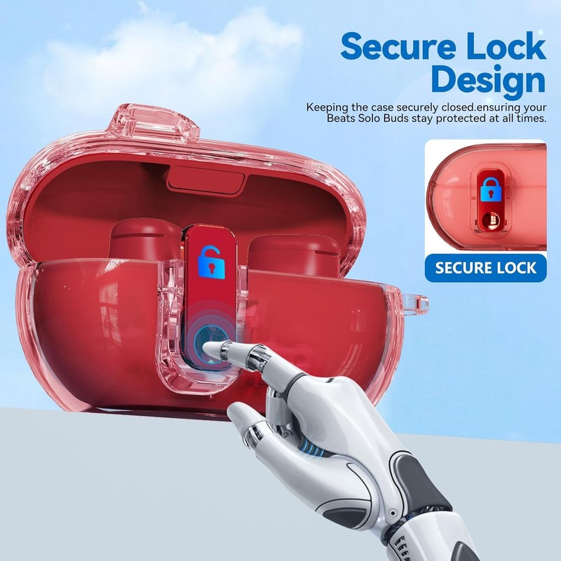 Seucre Lock Case for Beats Solo Buds 2024, with 3-in-1 Cleaner & Keychain, Ekoonpft Soft TPU Cases Cover Compatibility with Beats Solo Buds Wireless Bluetooth Earbuds, Full Protection (Clear Red)