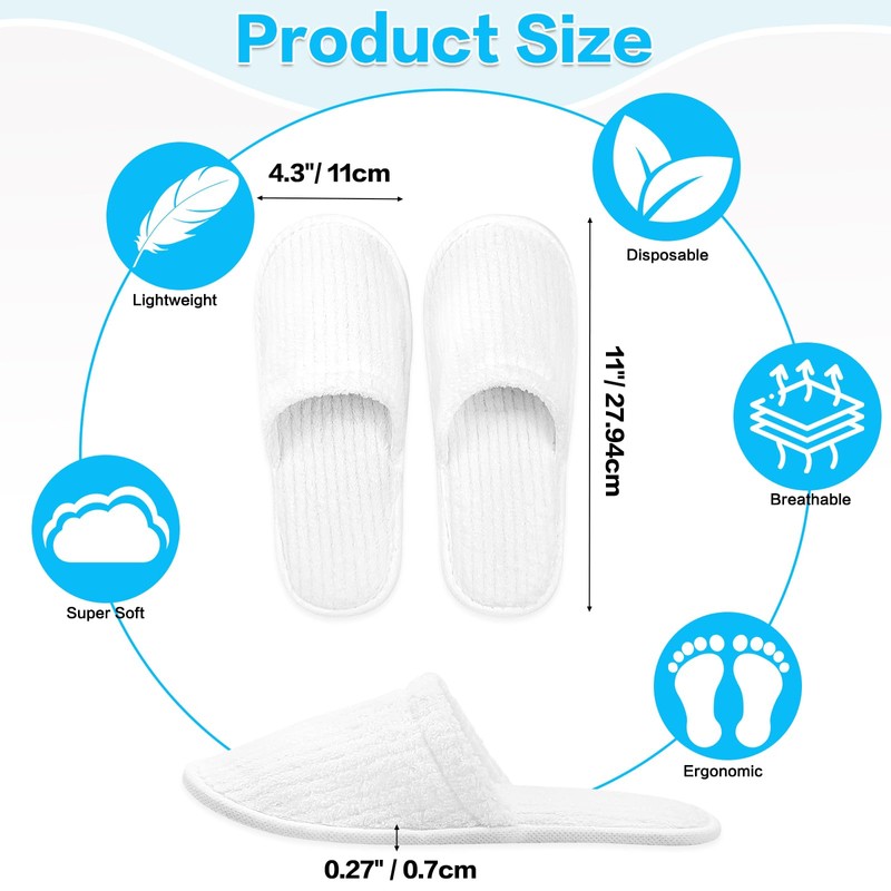 - 20-Pair Bulk Set: Includes 20 pairs of white disposable slippers (11"/ 27.94cm x 4.3"/ 11cm x 0.27" / 0.7cm) - one-size-fits-most design for versatile use in homes, hotels, and spas