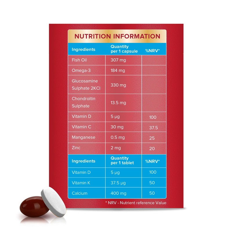 • CONTENTS: x30 capsules of Seven Seas JointCare, with Omega-3, Glucosamine, Chondroitin. Plus, Vitamins C and D, Zinc and Manganese to support an active lifestyle1-4. x30 Calcium and vitamins tablets containing Calcium, Vitamins D & K. 30-day duo pack