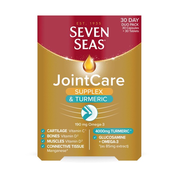- CONTENTS: 1x Seven Seas JointCare Supplex & Turmeric, with Glucosamine, Omega-3, Vitamins C and D, Manganese, To support an active lifestyle3,???, Duo Pack: 30 capsules + 30 tablets, 1 month supply