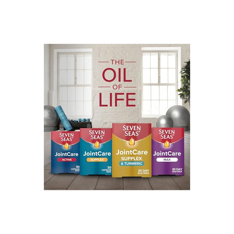 Product DescriptionOur only product to combine Omega-3 with Glucosamine and Turmeric in a single daily dose. Seven Seas JointCare Supplex & Turmeric has been specifically formulated with Vitamin C, Vitamin D and Manganese to provide 4in1 JointCare3,???. It supports 4 important components of the joint: cartilage?, bones3, muscles? and connective tissue?. Our entire JointCare Range is formulated to help support an active lifestyle. Omega-3 is essential because your body cannot produce it from scratch and you can only get it through outside sources such as diet and supplements. It supports three major organs in your body, your heart1, brain2 and eyes2. When these organs work normally, the heart pumps over 100,000 times a day, the brain passes information around at over 260 mph and over 100 million cells in the eye work to convert light into signals which enable you to see. We call Omega-3 'The Oil of Life'.?A daily intake of 250mg EPA (Eicosapentaenoic Acid) and DHA (Docosahexaenoic Acid) helps support normal heart function. 250mg DHA daily helps support normal vision and brain function. Vitamin D helps support the normal function of muscles, immune system, normal bones and plays a role in cell division.1Heart: A daily intake of 250mg EPA and DHA helps support normal heart function.2Brain and Vision: 250mg DHA daily helps support normal vision and brain function.3Bones: Vitamin D contributes to the maintenance of normal bones?Immune System: Vitamin D contributes to the normal function of the immune system.?Cartilage: Vitamin C contributes to normal collagen for the normal function of cartilage.?Muscles: Vitamin D contributes to the maintenance of normal muscle function.?Connective tissue: Manganese contributes to the normal formation of connective tissue.?Seven Seas Omega-3 fish oils are in Triglyceride form, a more absorbable Omega-3 form vs Ethyl estersDosage: Take one Supplex capsule plus one Turmeric tablet a day with a glass of cold water.Lactose free, gluten free, TiO2 free. Contains fish oil, crustacean, and beef gelatine.Box - Recycle Blister - Don't RecycleIngredientsTablet: Bulking Agents: Calcium Carbonate, Maltodextrin, Microcrystalline Cellulose, Turmeric Extract (from Curcuma Longa L. Root), Coating (Hydroxypropylmethylcellulose, Glycerol, Talc), Anticaking Agents: Silicon Dioxide, Stearic Acid, Magnesium Stearate Capsule: FISH Oil Concentrate (Triomega), Glucosamine Sulphate 2KCl (Crab (CRUSTACEAN)), Capsule Shell (Gelatin, Glycerol, Sorbitol Syrup, Colours: Iron Oxide, Carmine Red), Palm Oil, Emulsifiers: Beeswax, Sunflower Lecithin, Mono- and Diglycerides of Fatty Acids; Calcium Ascorbate, Alpha-Tocopheryl Acetate, Manganese Sulphate, Vitamin D Prep. (Fractionated Vegetable Oil, Cholecalciferol, DL Alpha Tocopherol)Safety WarningDosage: Take one capsule and one tablet a day with a cold drink. Do not exceed the recommended dosage.Manufacturer Contact InformationProcter & Gamble UK, Weybridge, Surrey, KT13 0XP