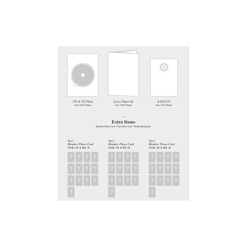 - Components : 1ea CD, 1ea Photo Book, 8p Lyrisc Paper, 1ea Boarding Pass, 1ea Member Photo Card, 1ea Unit Photo Card, 1ea Paddle Book Mark