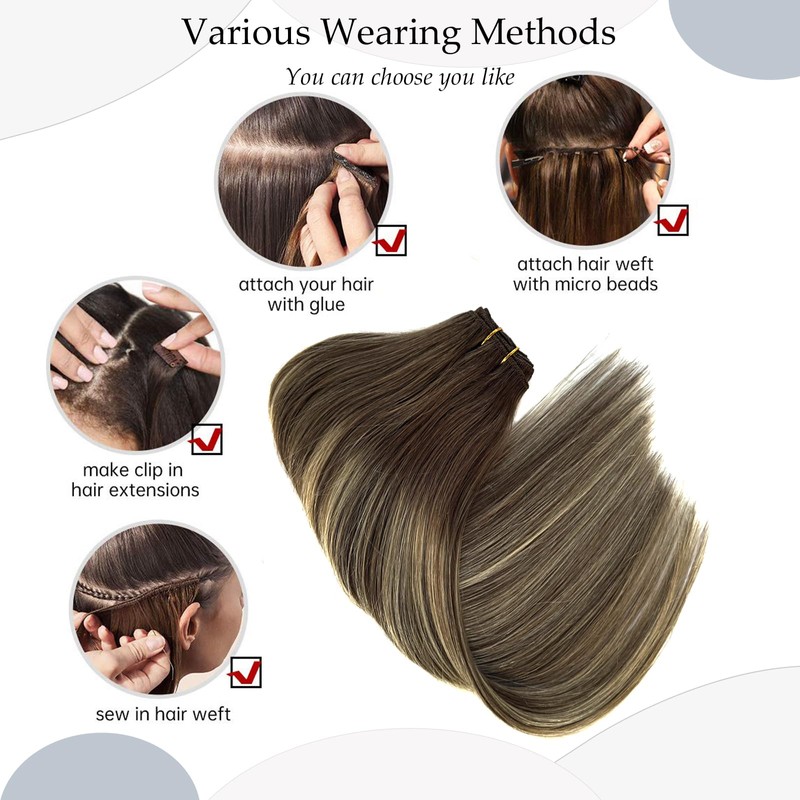 Ubetta weft hair extensions human hair sew in weave bundles human hair is of good quality in inexpensive price, sew hair extensions real human hair can be naturally blended with your own hair and can be washed, flat ironed, or curled by using hot tools, just like your own hair, no shedding, no tangles, no smell, silky soft. If you want to add hair length or volume to your own hair, balayage brown and blonde highlights weft hair extensions human hair sew in extensions is a perfect choice.
