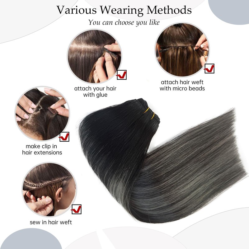 Sew in Hair Extensions Real Human Hair Wefts Extensions 100G 18 Inch Ombre Natural Black Balayage Silver Grey Highlights Hand Tied Weft Hair Extensions Real Remy Human Hair Bundles Weave Extensions