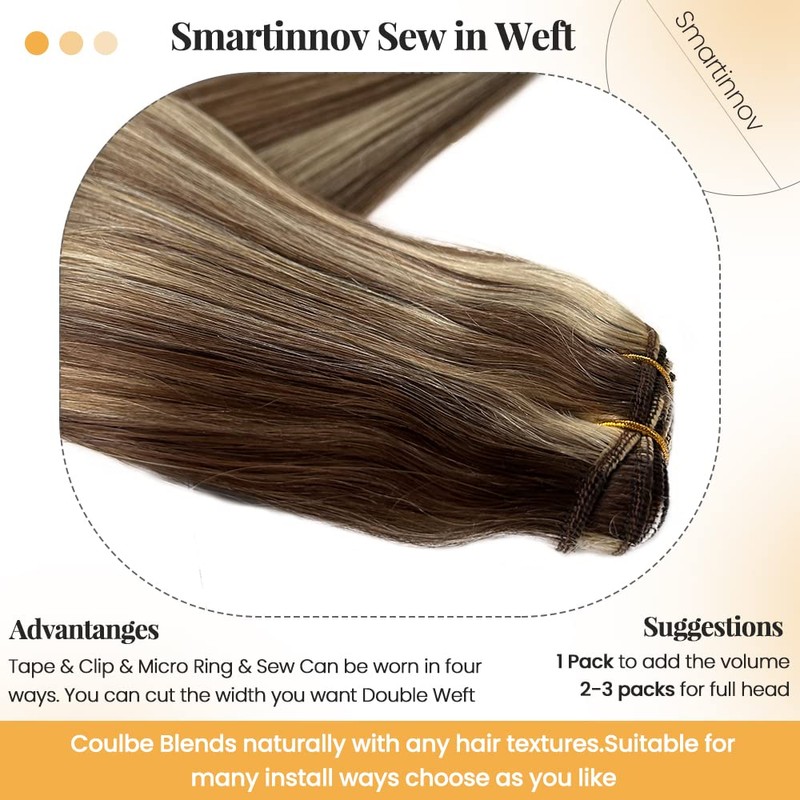 - 【Double Weft Hair Extensions Real Human Hair 】 Smartinnov Hair sew in blonde hair extensions has always used the double weft process, two wefts sewing together to make the hair sewing more compact,so that the weft hair extensions is not easy to fall off,more durable and lasts longer. Due to this process feature, there will be small short hairs at the root of the hair weft. Please understand that it is normal.