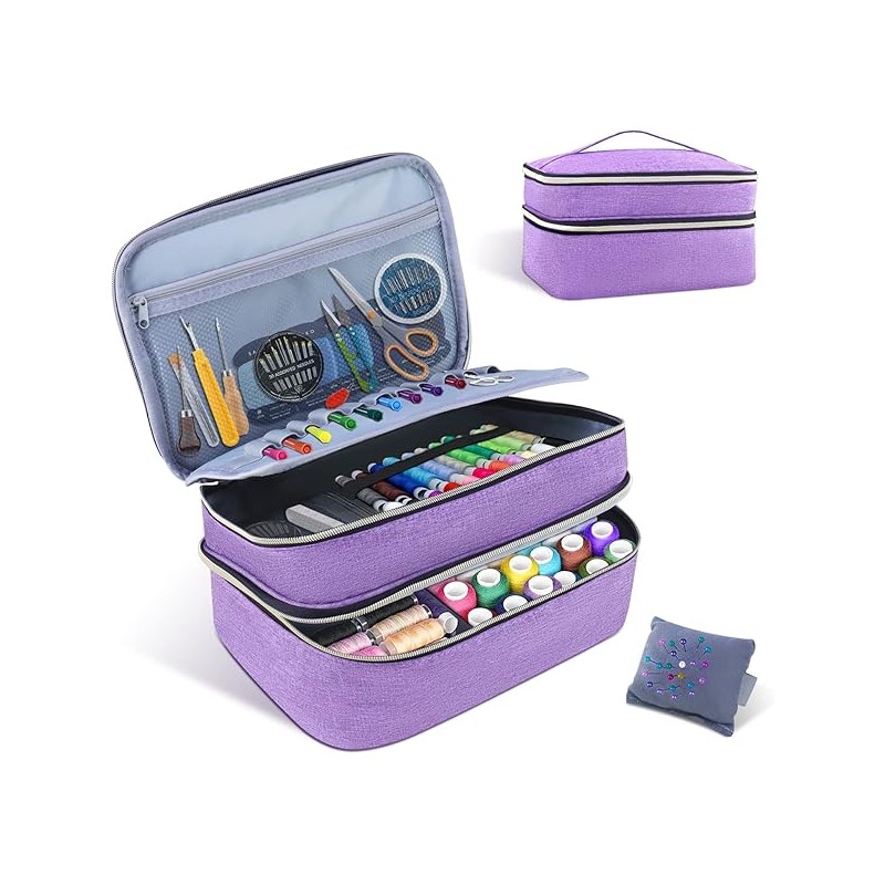 Sewing Organizer Bag - 11.5"x8"x6" Double-Layer Sewing Box with Storage for Scissors, Thread, Pins, Needles, Clips (Purple)