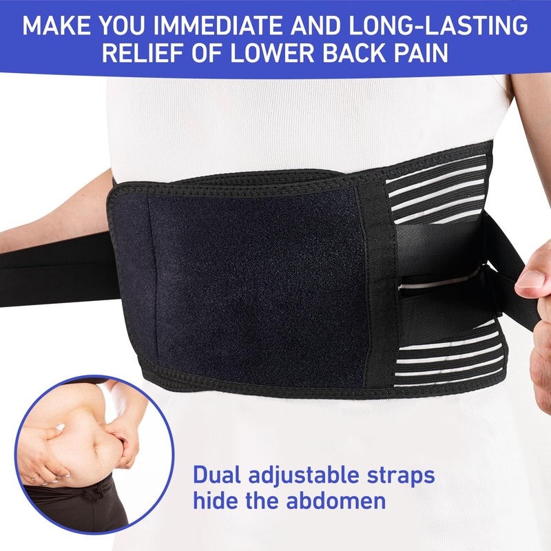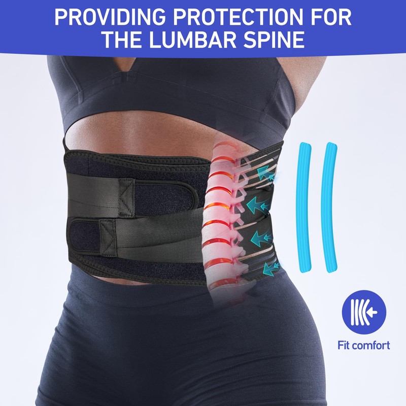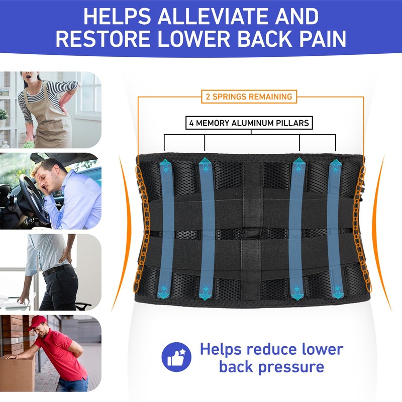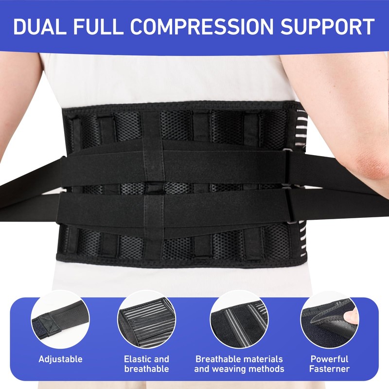 • Waist Support Straps Adopting the latest generation of ergonomic support system (1 biomimetic metal support bar, 4 memory aluminum columns and 2 elastic springs), it can achieve perfect custom fit and compression, and has elasticity and forms a complete back rehabilitation system.