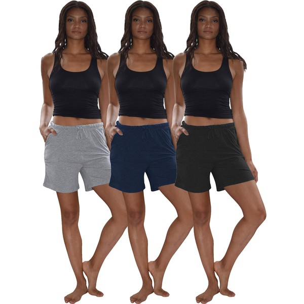 Sexy Basics Women's 3 Pack Cotton Sleep Pajama Shorts with Pockets & Drawstring (3 Pack- Black/Heather Grey/Navy, Large)